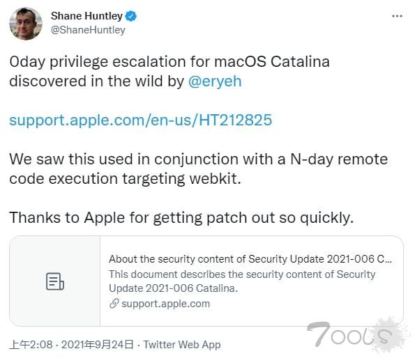 ● 4 月份曝出的一个可被 Shlayer 恶意软件利用的 iOS(CVE-2021-30661)和 macOS(CVE-2021-30657)零日漏洞。