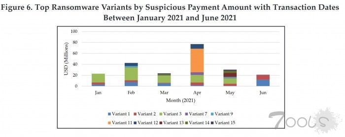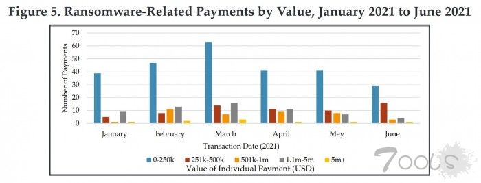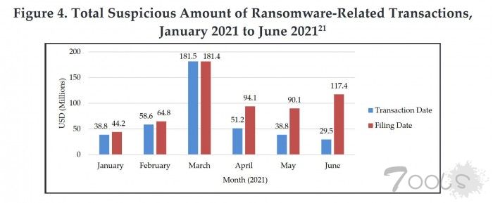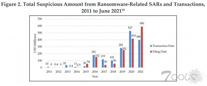 根据周五的报告,该报告基于银行和其他金融机构提交的可疑活动报告的数据,1 月至 6 月期间报告的疑似勒索软件付款总额为 5.9 亿美元。相比之下,2020 年全年报告的疑似付款价值共计 4.16 亿美元。