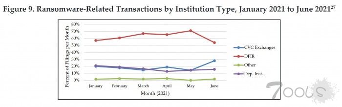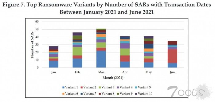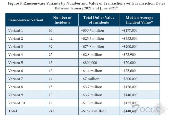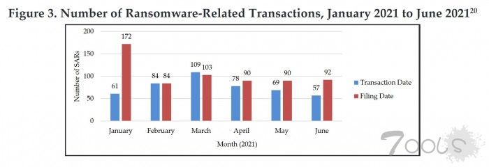 财政部表示,这一增长可能反映了与勒索软件有关的攻击的大幅增加,以及金融机构对这些攻击的检测和报告的改进。它指出,与 2020 年整个日历年相比,与勒索软件相关的可疑活动报告的数量也上升了 30%,达到 635 份。