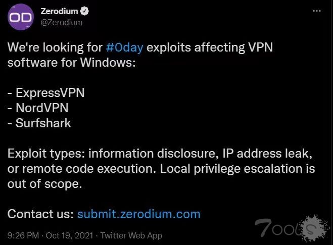 Zerodium目前关注的是影响Windows客户端NordVPN、ExpressVPN和SurfShark VPN服务的漏洞。它们共同服务着数百万用户,据报道,前两家公司声称全球至少有1700万用户。