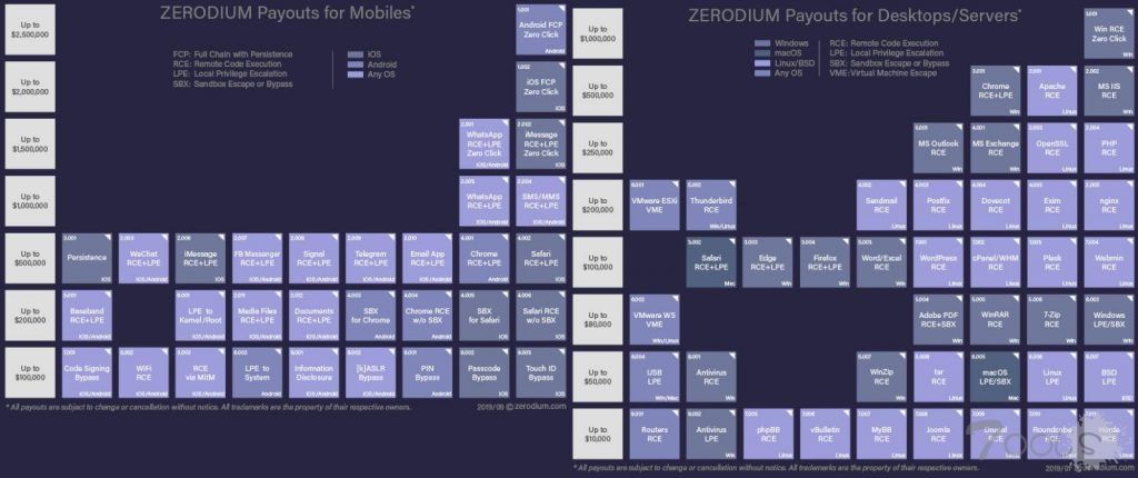 Zerodium为移动端和电脑端的任何操作系统都提供付费服务。最主要适用于Windows、macOS、LinuxBSD、iOS和Android。