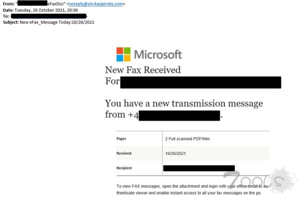这个以卡巴斯基为主题进行钓鱼攻击的网络犯罪分子并没有冒充卡巴斯基的员工。相反,这些钓鱼邮件通常都声称是 "传真通知",通过引诱目标进入虚假的网站,然后获取微软在线服务的凭证。这早已经不是第一次使用 "传真通知 "这种古老的诈骗术语了。2020年12月,Office 365的证书也受到了相同攻击方式的攻击。