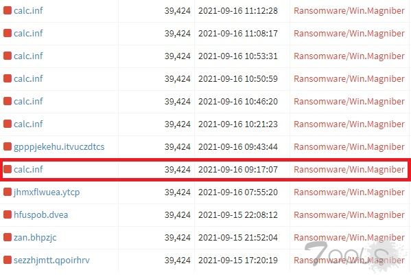 下图显示了文件名为 calc.inf 的 Magniber 的分布是在 2021 年 9 月 16 日 09:00 之后开始的,V3 检测日志大约有 300 个案例。