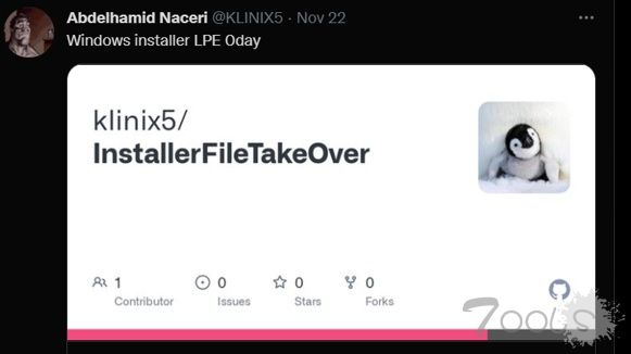 2021年 11 月22日,微软修复了一个“Windows 安装程序特权提升漏洞”漏洞,该漏洞编号为 CVE-2021-41379。安全研究员 Abdelhamid Naceri在检查该漏洞修复情况后,发现了一个补丁绕过漏洞和一个更强大的新零日特权提升漏洞。并在推特公开披露了后者的漏洞利用代码项目,该漏洞可在 Windows 10、Windows 11 和 Windows Server系统上直接提权到system最高权限。