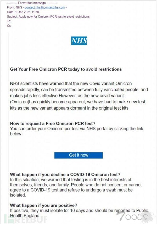 英国消费者保护组织“Which”公布了两封伪装自英国国家卫生服务 (NHS)的钓鱼电子邮件样本,声称可为收件人提供免费的奥密克戎核酸检测。