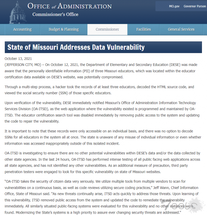 帕森和 DESE 显然并不感激这名记者,并立即指责 Renaud “入侵” 了 DESE 网站。密苏里州教育专员 Margie Vandeven 致信教育工作者说:“一个人获取了至少三名教育工作者的记录,从网页上解密了源代码,并查看了这些特定教育工作者的社会安全号码。”