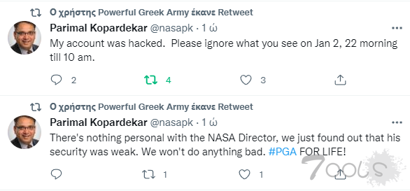 美国宇航局局长兼空中交通高级技术专家的推特账号帕里马尔・科帕德卡尔先生(@nasapk)被希腊军队入侵。