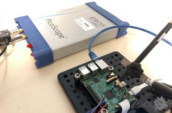 此外树莓派上配备了一个 Picoscope 6407 示波器、以及一个 H-Field 探头,用于检测电磁(EM)场的变化。