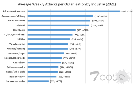 新的渗透技术和规避方法使黑客更容易执行恶意意图。最令人震惊的是,一些举足轻重的社会行业涌入受攻击最多的名单。教育、政府和医疗行业进入了全球最受攻击行业的前五名。Check Point 发现,就 2021 年而言,每周对企业网络的总体攻击比 2020 年增长了 50%,在第四季度,他们看到每个组织每周受到的网络攻击达到了 925 次,创下历史新高。