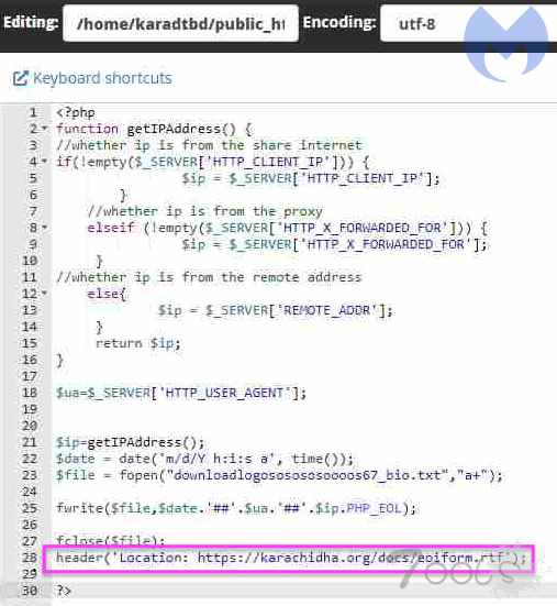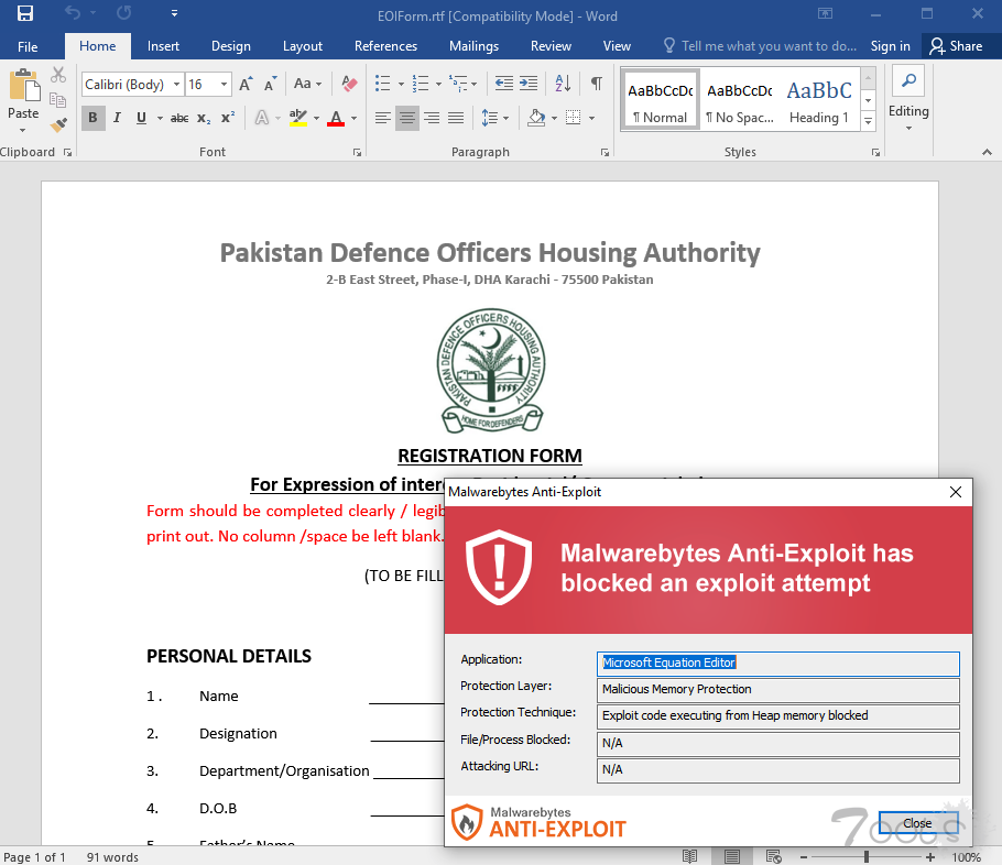 为了将木马分发给受害者,Patchwork用冒充巴基斯坦政府的文件引诱他们。例如,攻击者将名为EOIForm.rtf 的文档上传到他们自己的服务器 karachidha[.]org/docs/。