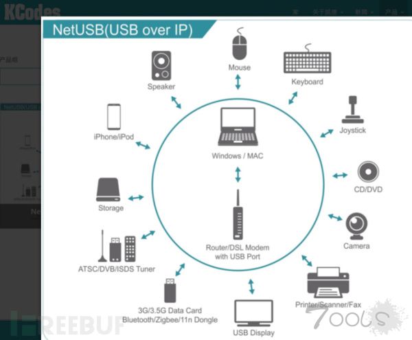 台湾USB解决方案提供商KCodes,专门从事USB over IP软件开发。NetUSB是KCodes开发的一种内核模块连接解决方案,允许网络中的远程设备与直接插入到路由器的USB设备进行交互。只要路由器厂商在设备上添加USB端口,用户便可以通过这一端口共享联网的打印机和USB驱动器。