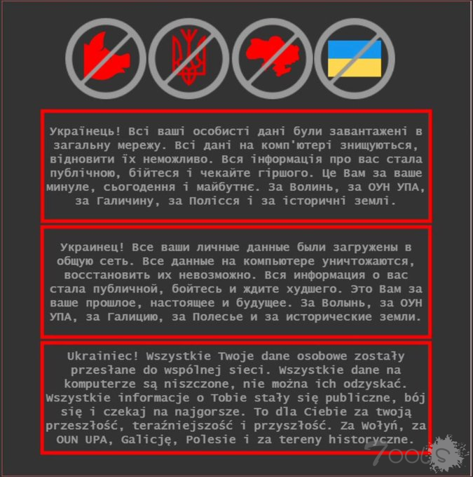 “乌克兰!您的所有个人数据都已发送到公共网络。您计算机上的所有数据都已损坏且无法恢复。所有关于你的信息都被刺伤(公开、童话和等待最坏的情况。它是为你的过去、未来和未来。为 Volhynia、OUN UPA、加利西亚、波兰和历史地区。“阅读消息的翻译.