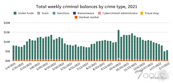 有两件事最为突出:第一是 2021 年犯罪余额的巨大增长,在年底,犯罪分子持有价值 110 亿美元的已知非法来源的资金,而在 2020 年底,这一数字仅为 30 亿美元。第二个是被盗资金的主导程度。截至 2021 年底,被盗资金占所有犯罪余额的 93%,为 98 亿美元。暗网市场资金紧随其后,为 4.48 亿美元,其次是诈骗,为 1.92 亿美元,欺诈商店为 6600 万美元,勒索软件为 3000 万美元。
