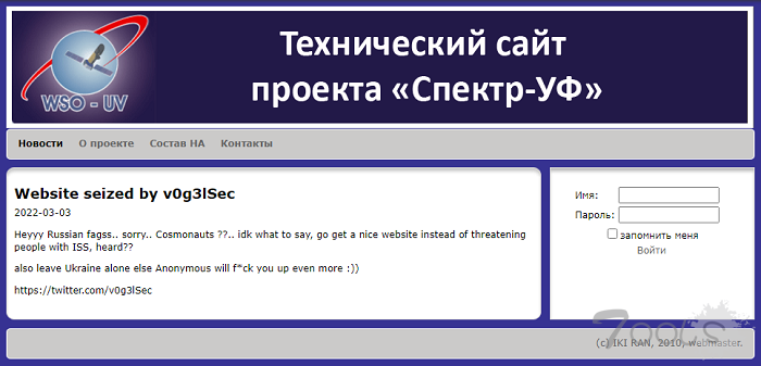 “匿名者”组织刚刚宣称破坏了一个属于俄罗斯空间研究所(IKI)的网站,并在推特上发布了指向俄罗斯联邦航空局(Roscosmos)泄露数据的缓存页面的链接