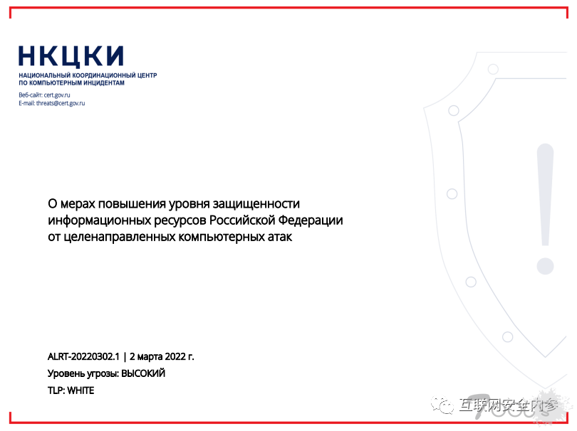 3月2日,俄罗斯国家计算机事件响应与协调中心发布“保护信息资源免受计算机攻击的建议”安全预警,称当前俄罗斯信息资源正受到大规模计算机攻击,建议使用一系列措施以应对安全威胁。