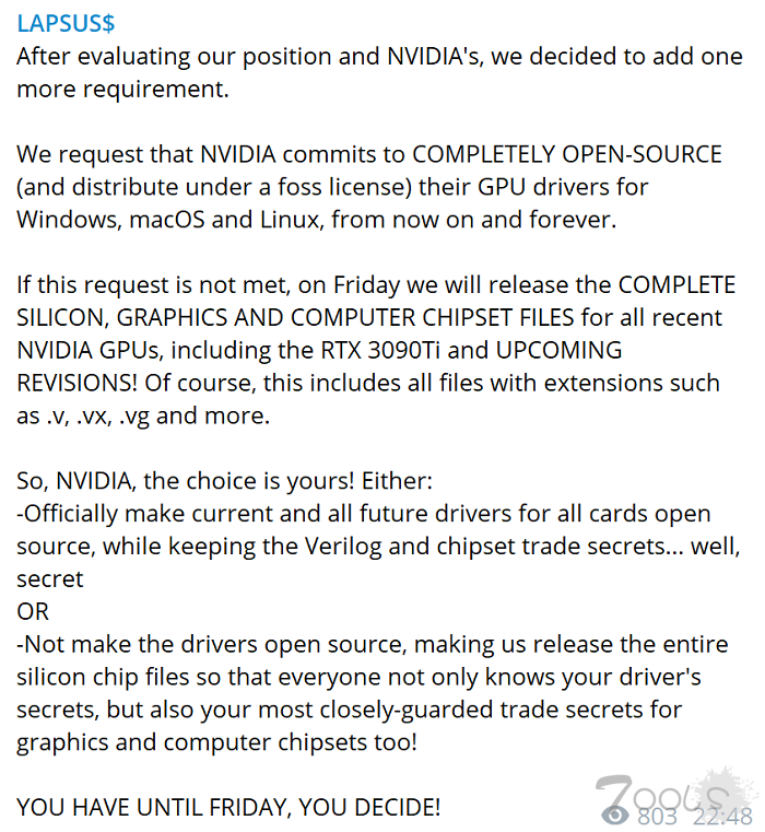 此前 LAPSUS$ 黑客组织曾提出荒唐的要求,希望英伟达永久开源其 GPU 驱动程序、或彻底解锁 GeForce RTX 30 系列 LHR 显卡的加密货币挖矿算力。