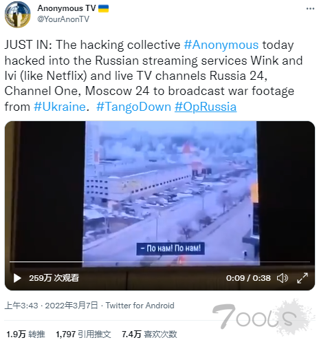 匿名者骇入俄罗斯流媒体平台播放俄乌战争画面