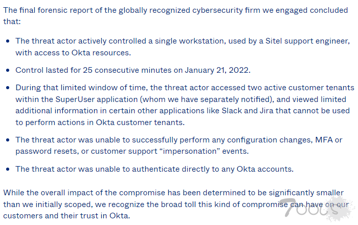 之前评估的受影响客户数量多达 366 个,但新报告也精确到了只有 2 个 Okta 客户的身份验证系统被 Lapsus$ 摸到过。