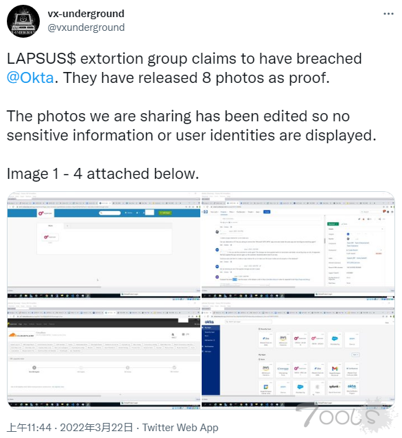 【事件回顾】2022 年 1 月 21 日,Lapsus$ 黑客远程访问了属于 Sitel 员工的机器,进而入侵了 Okta 的系统,因为该公司分包负责了 Okta 的部分客户服务。
