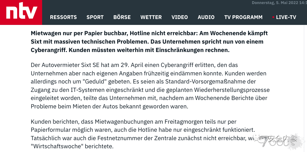 国际汽车租赁巨头 Sixt 遭到网络攻击,部分业务系统被迫中断,运营出现大量技术问题;