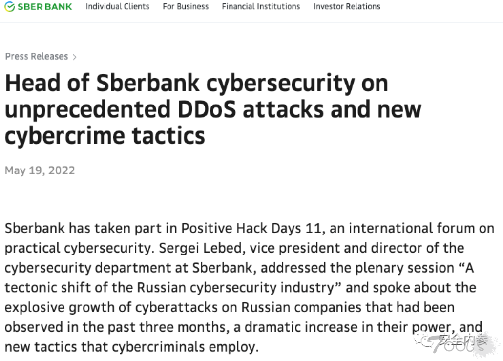 安全内参消息,5月19日,俄罗斯最大银行Sberbank(联邦储蓄银行)官网披露,在5月6日成功击退了有史以来规模最大的DDoS攻击,峰值流量高达450 GB/秒。 次日,普京召开俄罗斯联邦安全会议,称正经历“信息空间战争”。他提出了三项关键任务,以确保俄关键信息基础设施安全。