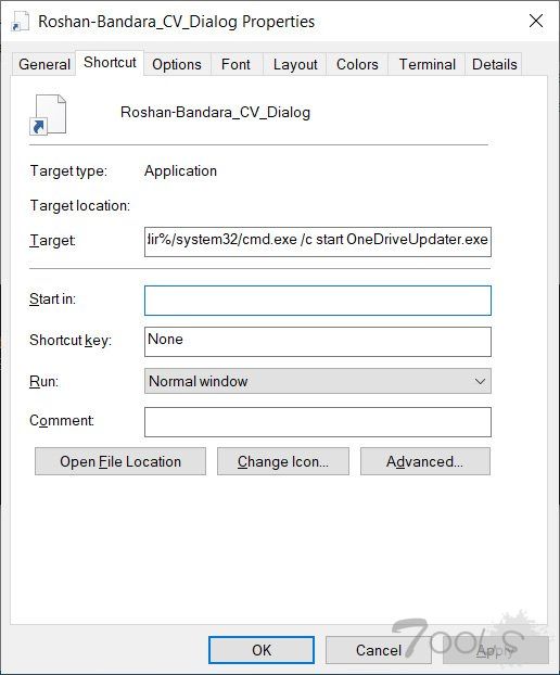 但是,“Roshan-Bandara_CV_Dialog”简历文件实际上是一个 Windows 快捷方式,它将启动捆绑的 OneDriveUpdater.exe 文件,如下面的文件属性所示。