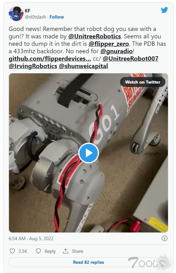 名为 d0tslash 的一个黑客用户在推特上说,“还记得你看到的那只背着枪的机器狗吗?!它是由“ UnitreeRobotic”制造的。看来你只需要把它扔进垃圾桶就行了。PDB 有一个433兆赫的后门。”