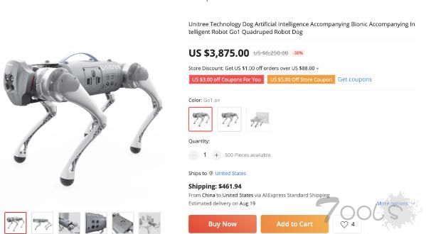 视频中的机器狗被认出来是UnitreeYusu的一只“科技狗”,在全球速卖通(AliExpress)的售价大概是3000美元,从脚、接口的位置和关节来看,是基本相同的。