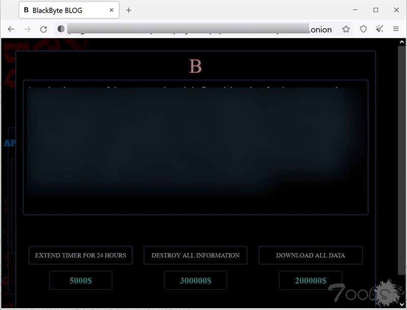 目前,还不清楚勒索软件加密器是否也发生了变化,但 BlackByte 团伙已经启动了新的 Tor 数据泄露网站。虽然数据泄露网站目前仅有一名受害者,但数据泄露网站有了新的勒索策略,允许受害者付费将其数据的发布时间延长 24 小时(5,000 美元)、下载数据(200,000 美元)或销毁所有数据(300,000 美元) )。这些价格可能会根据受害者的规模 / 收入而变化。