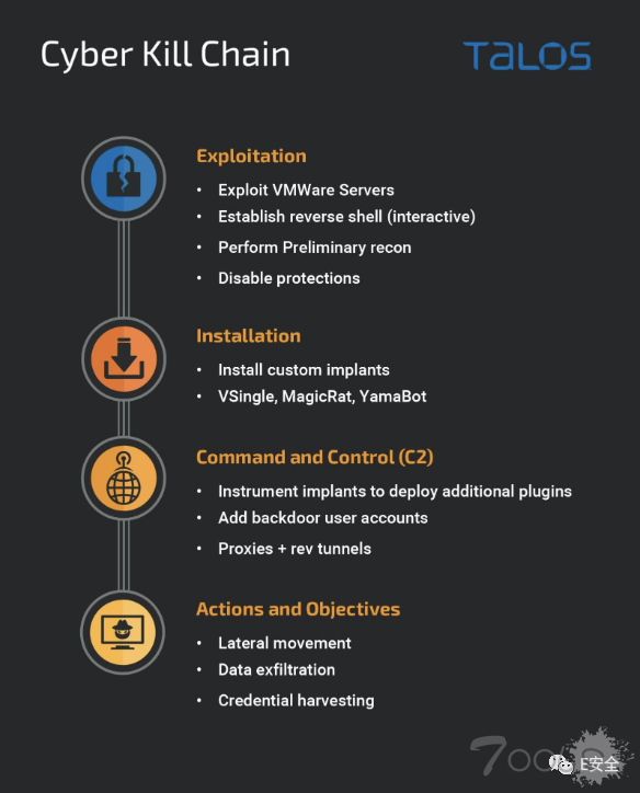 Cisco Talos 指出,Lazarus 把 VMware 产品中的 Log4Shell 漏洞当作进入企业网络的初步通道,继之再部署该集团所开发的恶意程序,以常驻于受害网络上,目的是为了窃取这些组织的机密资讯与智慧财产,以进行间谍活动或是支持朝鲜政府的目标。由于 VMware Horizon 是以管理权限执行,使得黑客完全不必担心权限问题,并在进入受害网络之后,关闭系统的防毒软件。