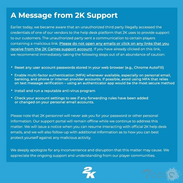 黑客活动猖獗:2K发公告表示服务网站遭到黑客攻击 2022-09-22 14:09:08 1 团子 1309 如果您已经点击了此链接,2K 建议立即采取安全预防措施,包括重置您存储在浏览器中的所有密码、对任何帐户启用双重身份验证以及运行杀毒程序。 如果您已经点击了此链接,2K 建议立即采取安全预防措施,包括重置您存储在浏览器中的所有密码、对任何帐户启用双重身份验证以及运行杀毒程序。 同时 2K Support 也将暂时下线,一旦恢复,2K 将发布公告通知玩家。 类别 新闻资讯 关于作者 团子82篇文章175篇回复