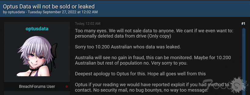27 日,被指控的 Optus 黑客在 breach 上发布了一条新消息,称由于对数据泄露的审查加强,被窃取的数据将不再出售或泄露给任何人。该威胁行为人还声称,窃取的数据已经从他们保存唯一副本的设备中删除,并向暴露的 Optus 客户和公司道歉。“太多的眼睛。我们不会将数据出售给任何人。即使我们想,我们也做不到:亲自从硬盘删除数据 (只有副本),” 威胁行为者声称。 值得注意的是,该用户从未被正式确认为对 Optus 入侵事件负责的个人或组织。然而,停止勒索该公司的决定可能是对澳大利亚联邦警察(AFP)昨天宣布的 “飓风行动” 的回应,他们发起了 “飓风行动”,以确定入侵和勒索要求背后的威胁行为者。AFP 宣布:“我们知道有报告称,窃取的数据在暗网上出售,这就是为什么 AFP 正在使用一系列专业功能监控暗网。”“使用假名和匿名技术的罪犯看不到我们,但我可以告诉你,我们可以看到他们。” 作为这次行动的一部分,AFP 正与海外执法部门密切合作,以确定和逮捕袭击的幕后黑手。如果 AFP 查明 Optus 入侵事件的责任人,他们将面临最高 10 年的监禁。