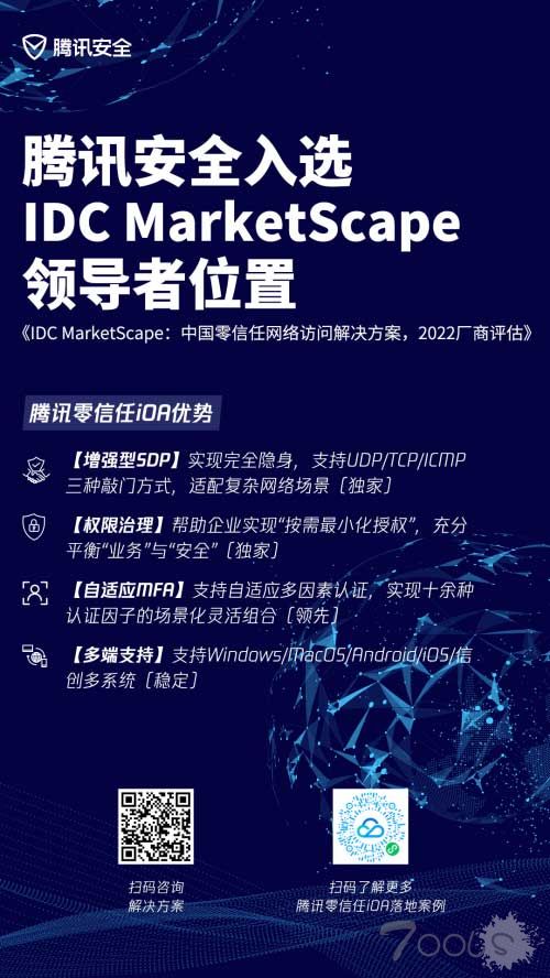 近日,国际权威研究机构IDC发布了《IDC MarketScape:中国零信任网络访问解决方案,2022厂商评估》(以下简称报告),国内24家零信任网络访问解决方案技术服务提供商进行了深度研究。腾讯安全凭借零信任iOA在产品、市场和业务等方面的优势脱颖而出,位居领导者位置。