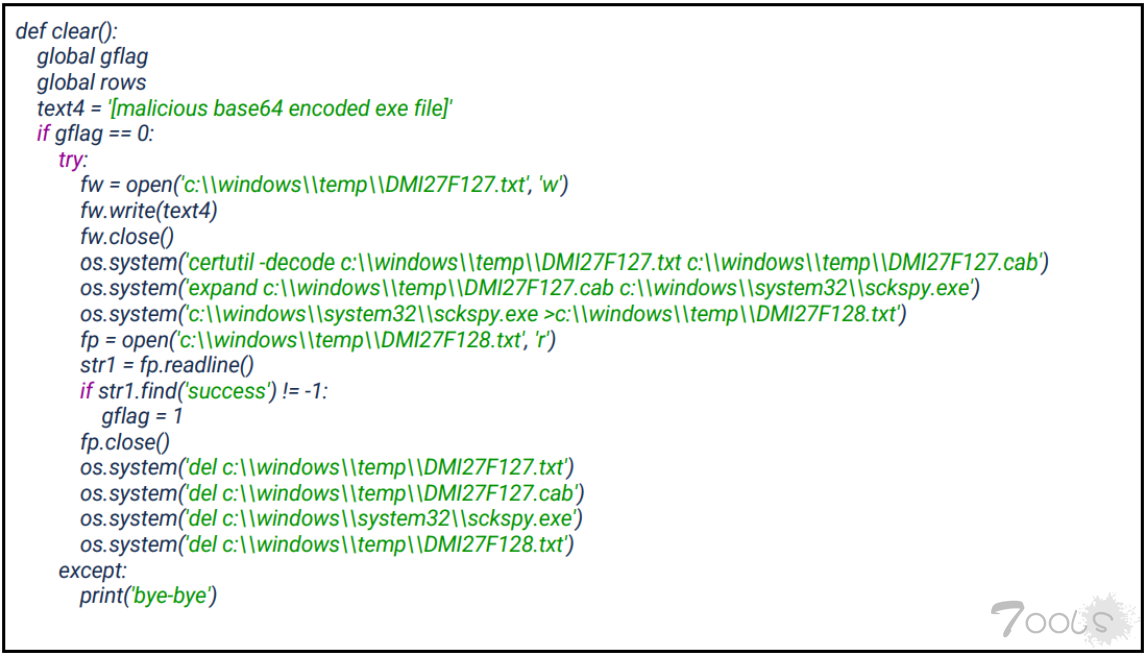 最后,“Cllo”字符串调用 clear() 函数,该函数会删除一个名为“sckspy.exe”的黑客工具,该工具会禁用服务控制管理器上的事件日志记录。