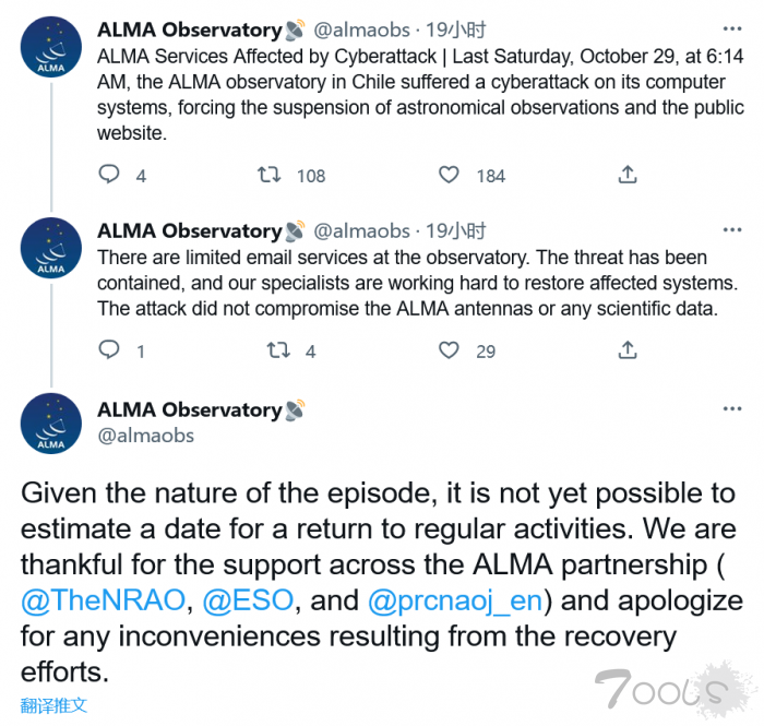 世界上最先进的射电望远镜之一在一次网络攻击后处于离线状态,目前还不清楚何时能再次开始科学运作。位于智利的阿塔卡马大型毫米/亚毫米阵列(Alma)天文台在10月29日受到了网络攻击,天文台在周三的一条Twitter上说。这次攻击阻碍了天文台的计算机系统,使天文台的公共网站和射电望远镜的天线都处于离线状态。