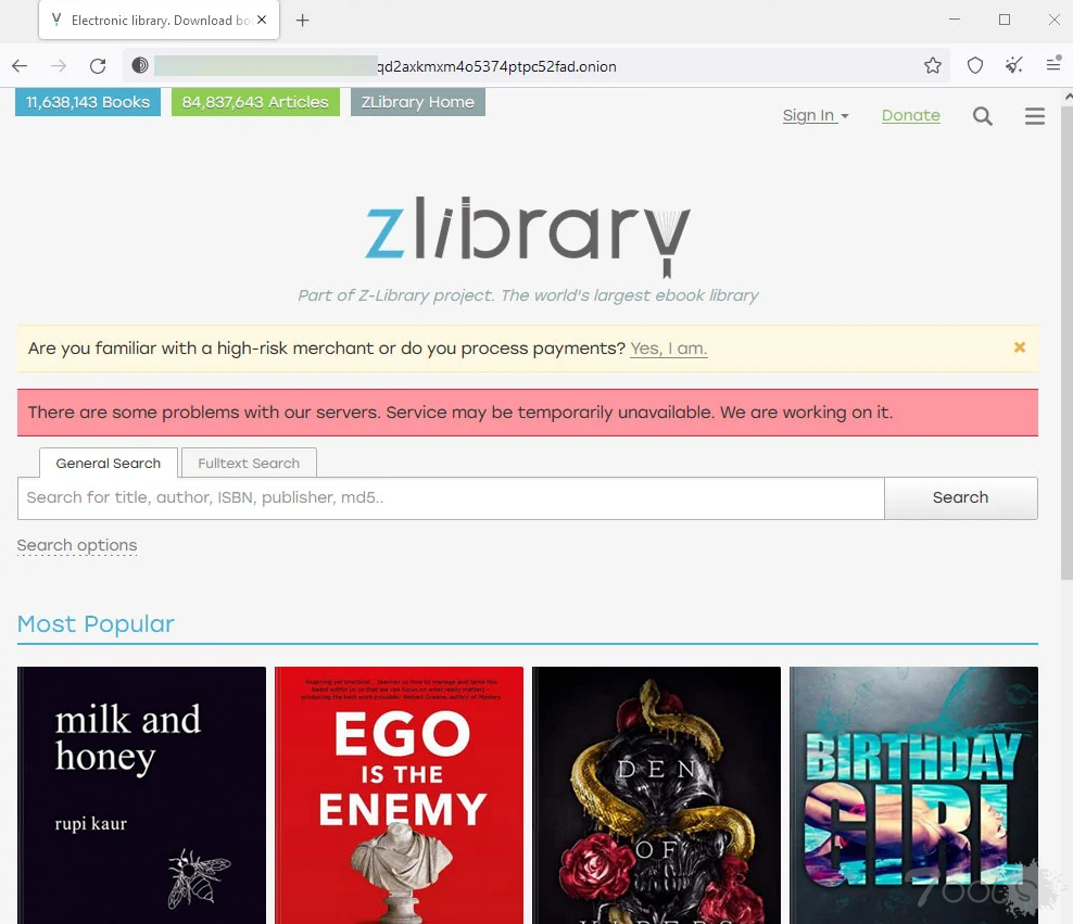 即使明网站点仍然不可用,Z-Library仍然可以通过其Tor Onion地址访问。但是,现在有一条通知通知,通知访问者服务器问题可能导致服务暂时不可用。