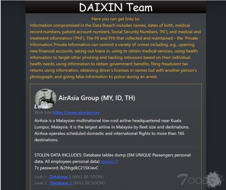 名为Daixin Team的网络犯罪组织在其数据泄露门户网站上泄露了属于马来西亚低成本航空公司亚航的样本数据。