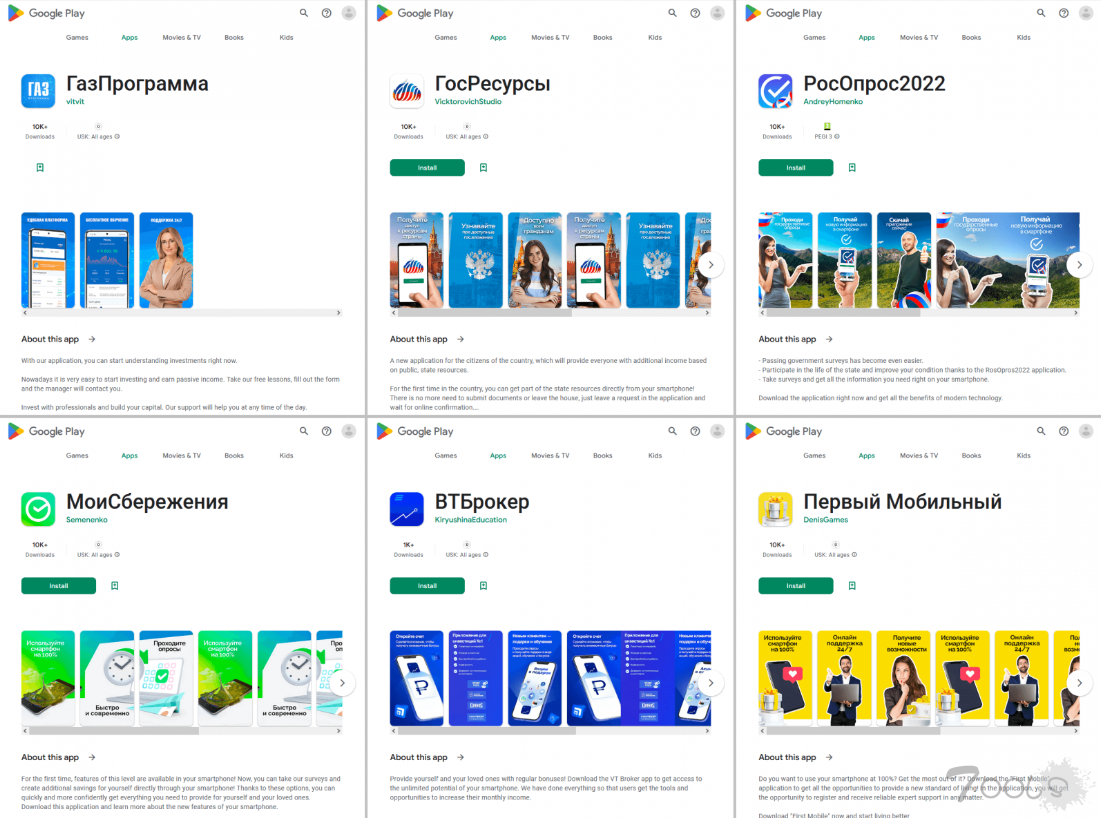 最后,Web 博士发现了一组声称与俄罗斯银行和投资集团有直接关系的贷款诈骗应用程序,每个应用程序在 Google Play 上的平均下载量为 10,000 次