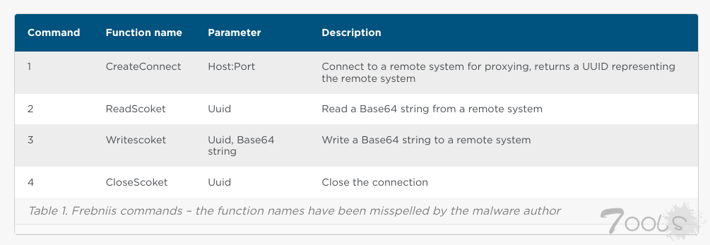 为启用代理,编码字符串先进行 Base64 解码,然后解密 (xor 0x08),第一个字符表示代理命令,后跟预期参数。 代理用于发送和接收来自其他计算机系统的 Base64 编码数据。 这允许攻击者通过受感染的 IIS 服务器与通常可能被 Internet 阻止的内部资源进行通信。