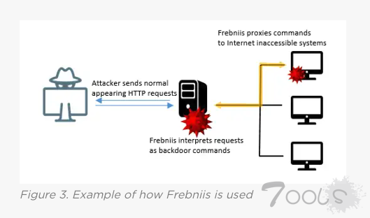 通过劫持和修改 IIS Web 服务器代码,Frebniis 能够拦截 HTTP 请求处理的常规流程并寻找特殊格式的 HTTP 请求。 这些请求允许远程代码执行和以隐秘方式代理到内部系统。 系统上不会运行任何文件或可疑进程,这使得 Frebniis 成为一种相对独特且罕见的 HTTP 后门类型。