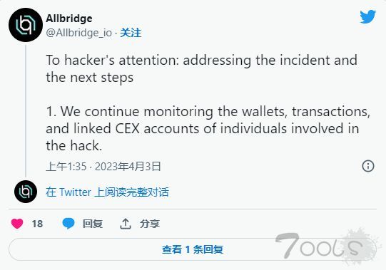 在一个单独的系列 鸣叫Allbridge 明确表示他们正在追踪被盗资金。