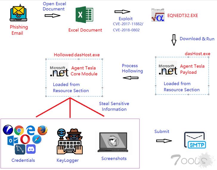 Fortinet FortiGuard Labs捕获了一个网络钓鱼活动,该活动使用特制的Microsoft Excel文档传播新的Agent Tesla变体,该文档利用了CVE-2017-11882,Microsoft Office的方程式编辑器中存在六年的内存损坏漏洞和CVE-2018-0802。