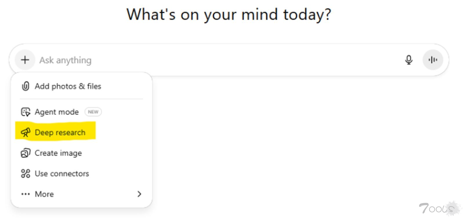 Deep Research 是 ChatGPT 于 2025 年 2 月推出的强大自主研究模式。代替你浏览互联网,查找某个主题的最新信息,并生成详细报告 ———— 提供主题后,它就会在接下来的 5 到 30 分钟内深入挖掘各类网站、文章甚至 PDF 文档,尽可能全面地学习相关内容。之后,它会交给你一份条理分明的详细调研报告,并展示所有信息来源(比如使用过的网页链接),方便你自行验证。可与 GitHub、Gmail 等App集成,让它安全地深度分析你的个人数据和文档。 点击 ChatGPT 文本框上的加号并选择“深度研究”即可激活 Deep Research 功能(如下图所示)