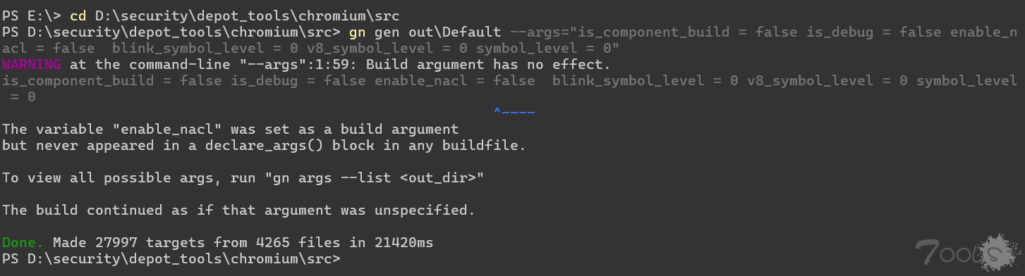 由于参数中包含了 enable_nacl = false,当前 Chromium 版本已经移除了Native Client支持,所以这个参数不再被任何 .gn 文件识别 ,该告警提示可以直接忽略。
