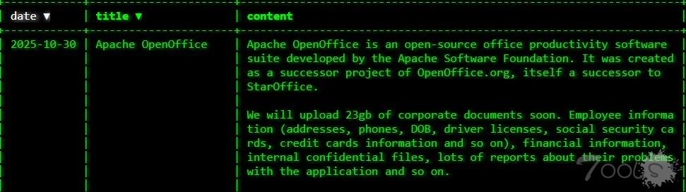臭名昭著的 Akira 勒索软件组织于 2025 年 10 月 29 日宣布,它已成功入侵Apache OpenOffice系统,窃取了高达 23 GB 的敏感企业数据。 该组织以其咄咄逼人的双重勒索手段而闻名,他们在暗网泄露网站上发布了详细信息,威胁称除非支付赎金,否则将公开这些信息。这一事件凸显了在网络威胁日益复杂的时代,即使是非营利性软件基金会也面临着不断升级的风险。 Apache OpenOffice 是Apache 软件基金会开发的免费办公效率工具的基石,长期以来一直是 Microsoft Office 等专有套件的便捷替代品。