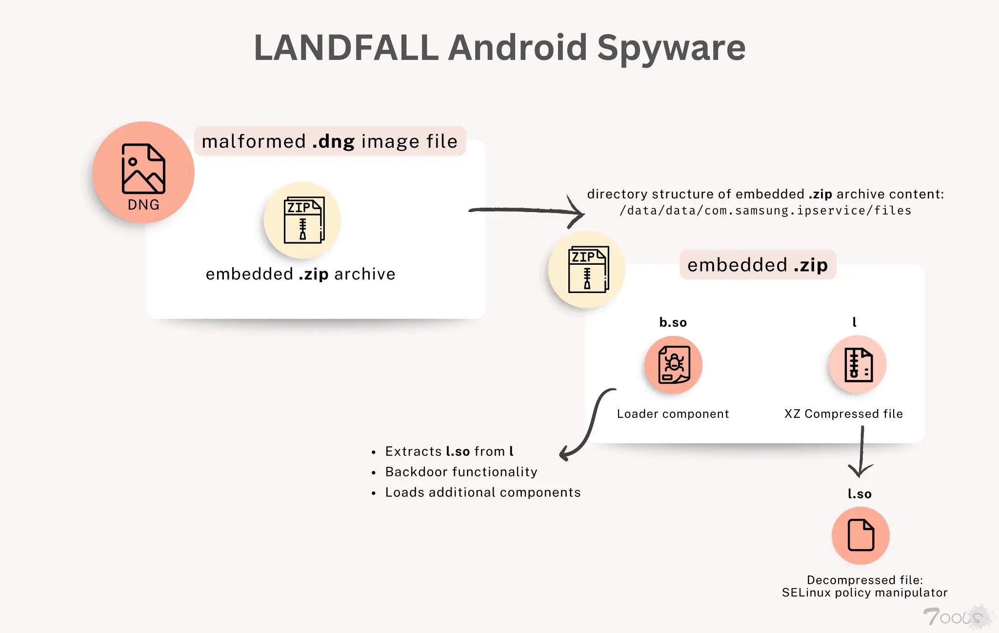 一款名为 LANDFALL 的复杂间谍软件攻击三星 Galaxy 设备,利用零日漏洞通过在WhatsApp上分享的看似无害的图片来渗透手机。