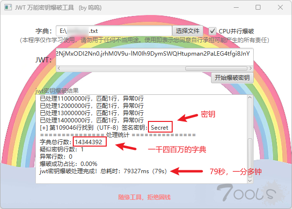 没啥用,实战中就没遇到过能爆出来的,jwt的密钥是随机生成的,没啥规律,爆破有啥意义,有这运气赶紧去买彩票,而且爆破工具最重要的是字典,工具一大堆久经考验的