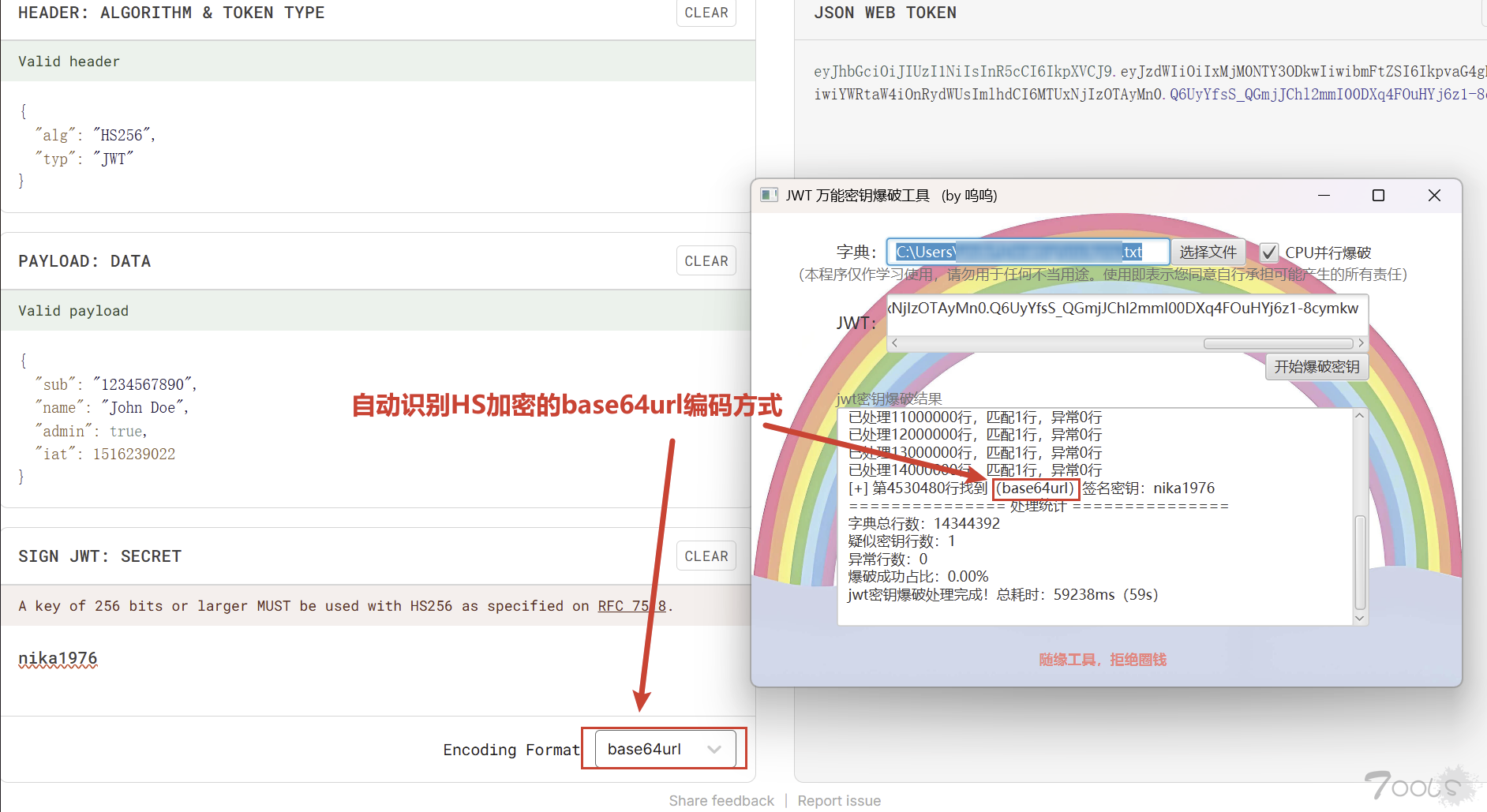 - 依然是这么厉害,因为写这个工具的初衷就是发现了base64url的短密钥即便字典中存在,大部分工具也爆不出来,因为他们大部分只是对字典进行ES的UTF-8进行爆破 (慢就算了,还不支持base64url,字典中有密钥都跑不出来,忍不了了)