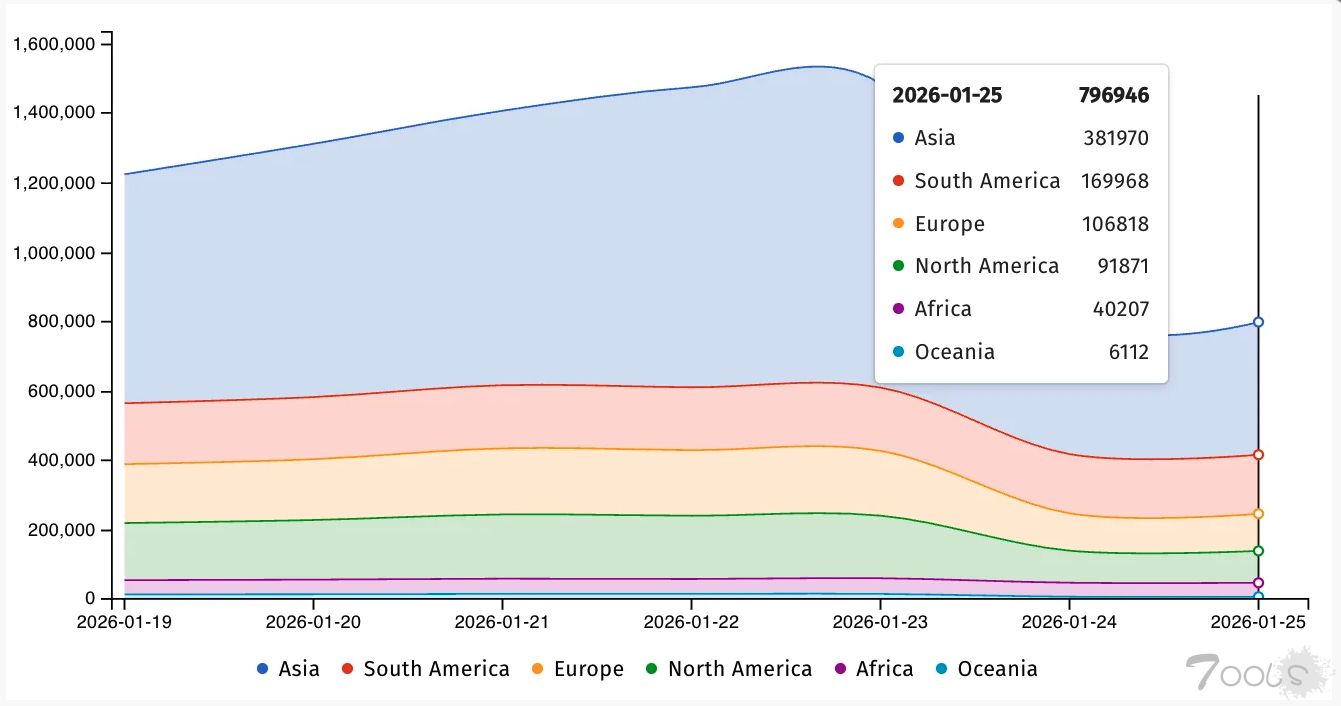 Shadowserver今天表示,他们正在追踪近80万个具有Telnet指纹的IP地址,其中超过38万个来自亚洲,近17万个来自南美洲,略超过10万个来自欧洲。然而,目前尚无信息表明有多少设备已采取措施抵御CVE-2026-24061攻击。
